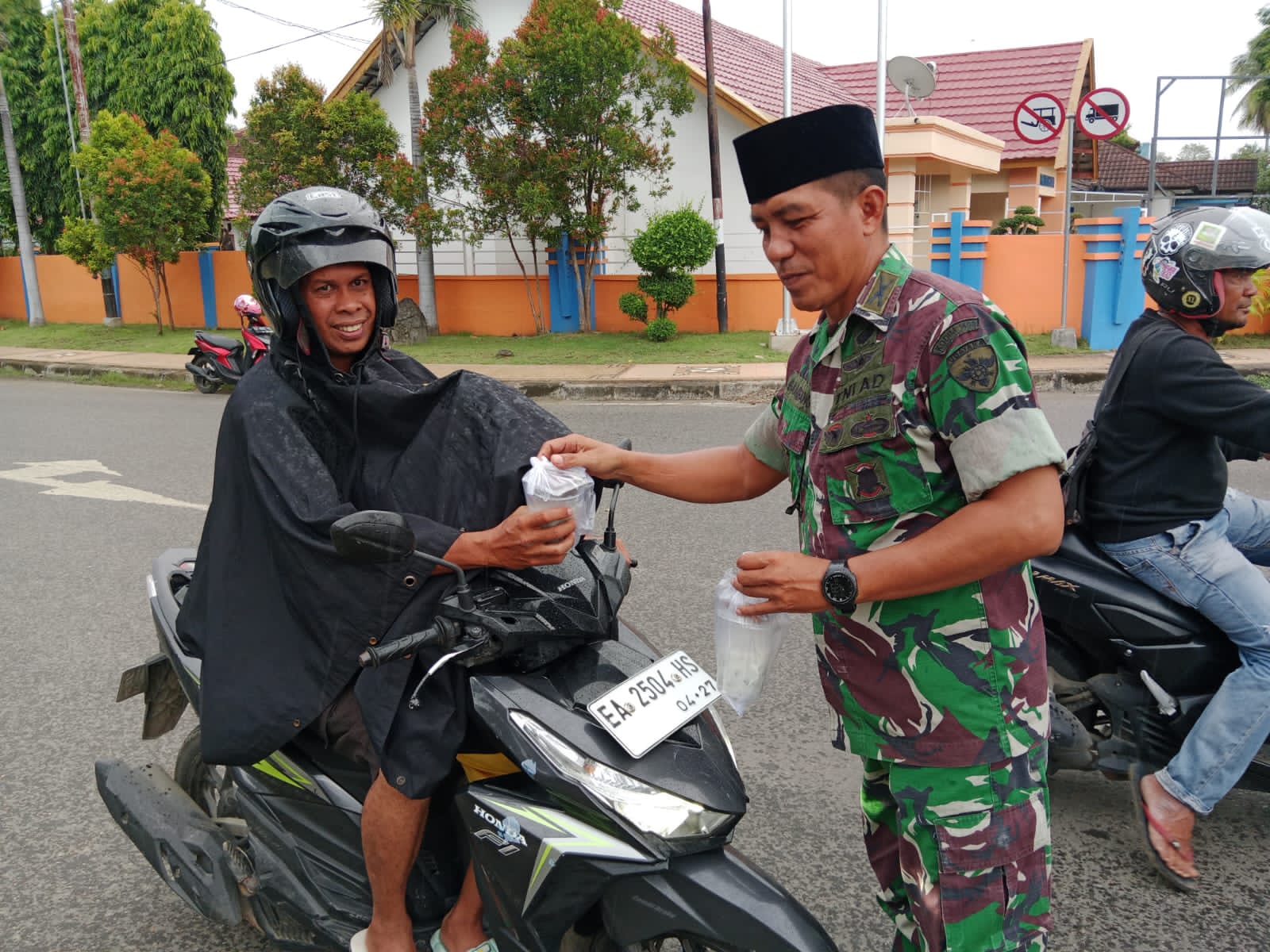 Tentara dan anggota Persit Kodim 1608/Bima turun langsung ke simpang Lampu Merah Gunung Dua untuk membagikan takjil kepada masyarakat yang sedang dalam perjalanan pulang. Total Ratusan porsi takjil disiapkan untuk dibagikan mulai dari Kodim sampai Koramil Jajaran secara serentak jelang buka puasa pertama , semoga menjadi berkah dan penyejuk di tengah-tengah perjalanan mereka” Ujar Kepala Staf Kodim.