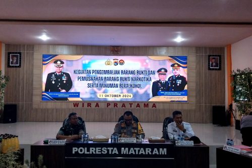 Nusa Brita Mataram — Polresta Mataram Berhasil mengungkap dan kembalikan barang bukti tindak pidana kejahatan sekaligus melakukan pemusnahan barang bukti narkotika serta minuman beralkohol di gedung wira Pratama Polresta Mataram Jumat (11/10/2024)