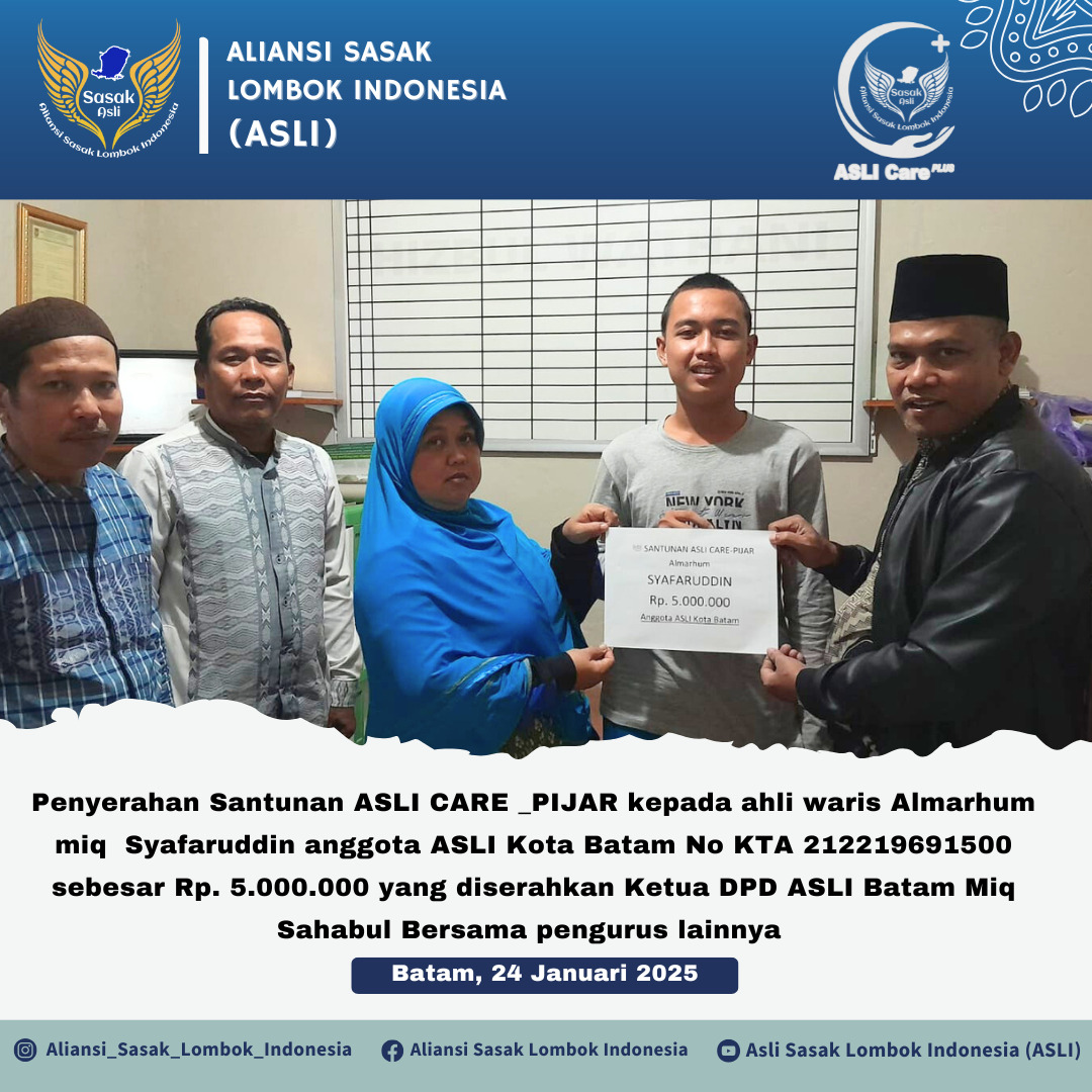 Nusa Brita | Batam – Bentuk kepedulian terhadap anggota ,Dewan Pengurus Pusat Aliansi Sasak Lombok Indonesia (DPP ASLI) melalui Pengurus DPD ASLI Kota Batam kembali menunjukkan kepedulian sosialnya dengan menyerahkan santunan ASLI Care berupa santunan kematian kepada keluarga almarhum Syafaruddin warga ASLI Kota Batam No. KTA 21221969500. Kegiatan ini merupakan bagian dari upaya ASLI untuk memberikan dukungan kepada anggota masyarakat yang sedang mengalami musibah.