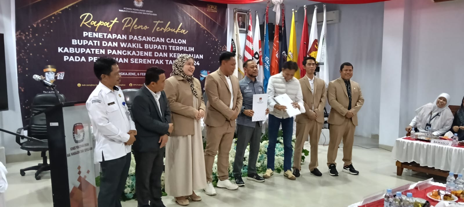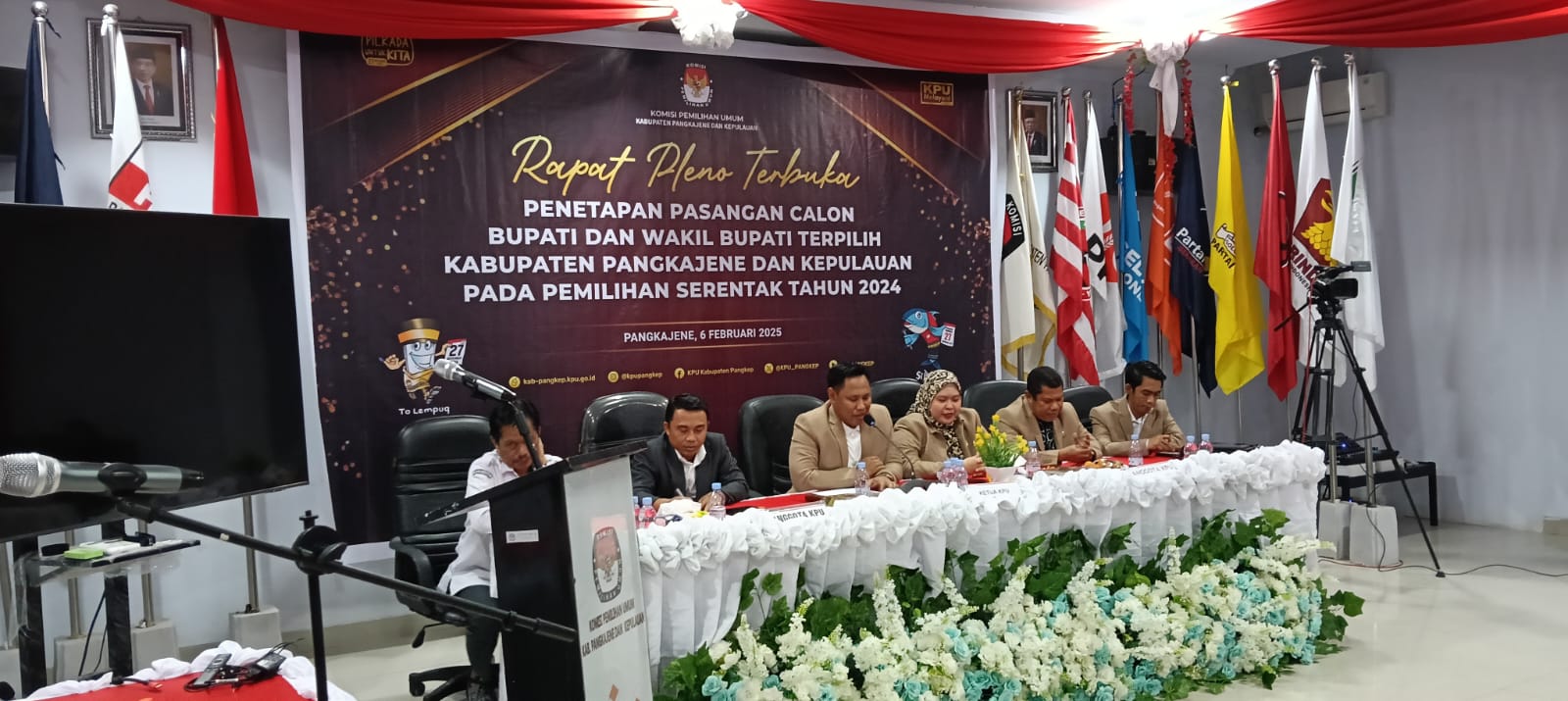 “Penetapan pasangan calon bupati dan wakil bupati Kabupaten Pangkajene dan kepulauan ini ditetapkan dan sekaligus sebagai pengumuman pada hari Kamis tanggal 6 bulan Februari tahun 2025 pukul 21.10 wita, dan keputusan ini mulai berlaku pada tanggal ditetapkan,” tambahnya.