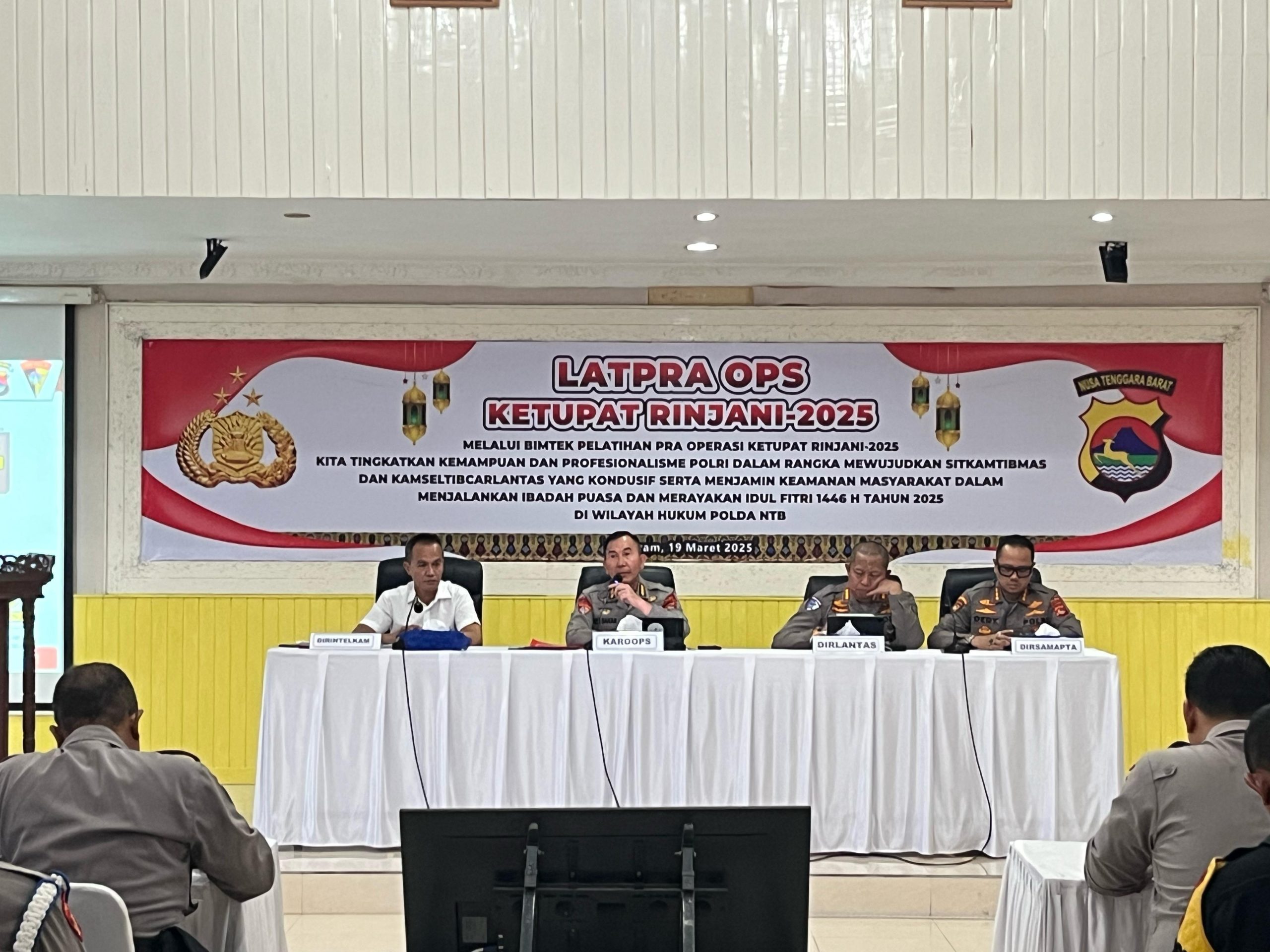 Nusa Brita | Mataram NTB – Menjelang pelaksanaan Operasi Ketupat Rinjani 2025 yang merupakan Operasi dalam rangka Pengamanan Hari raya Idul Fitri 1446 H, Polda NTB melaksanakan Latihan Pra Ops Ketupat Rinjani 2025 yang dipimpin Karoke Polda NTB Kombespol Abubakar Tertusy S.I.K., M. Han di Gedung Rupatama Polda NTB, Rabu (19/03/2025).