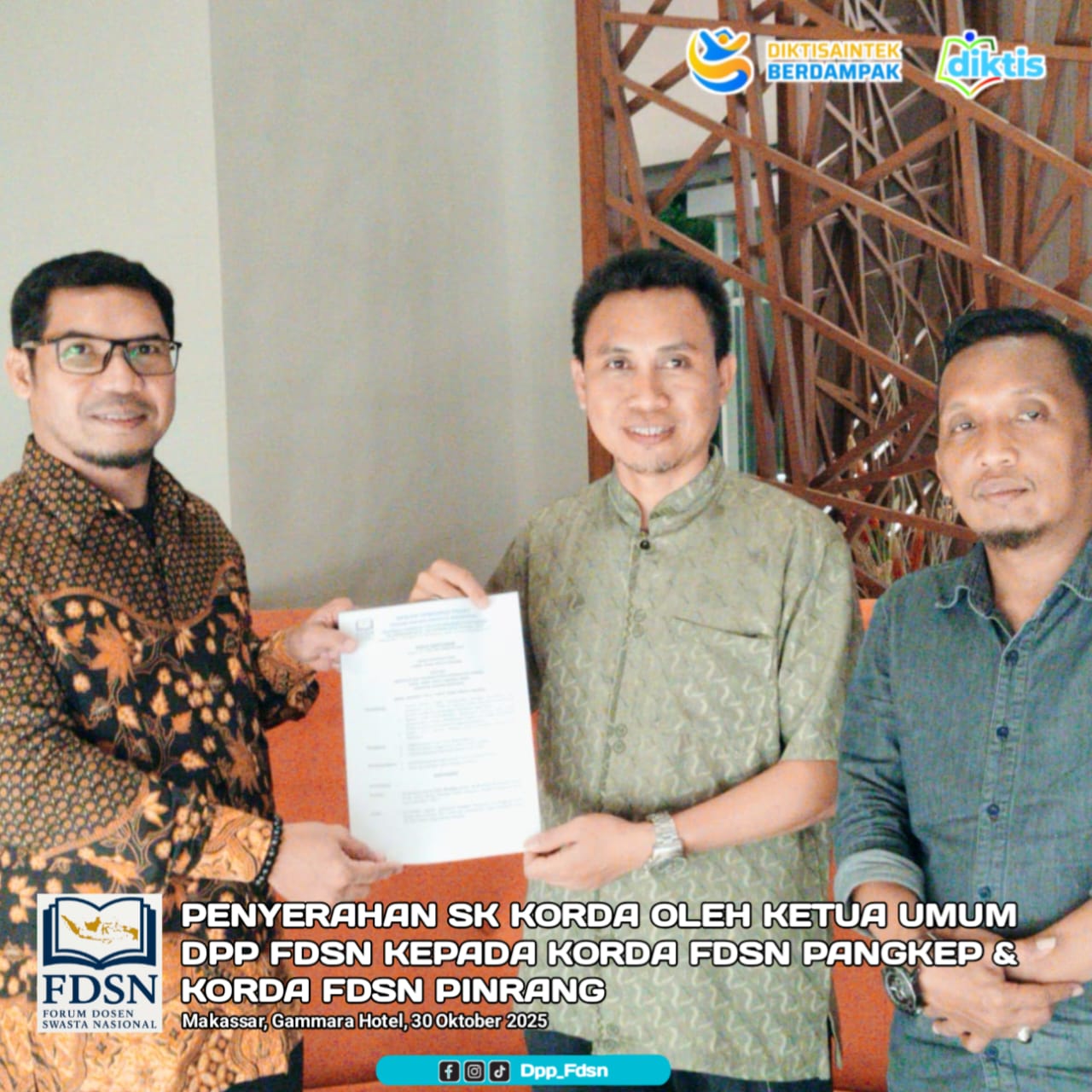 Ketua Umum DPP FDSN Muhammad Harun, SS., M.Pd., C.I menyerahkan langsung Surat Keputusan (SK) kepada Lalu Muliadi, S.Pd.I., M.Pd, atau yang akrab disapa Muliadi, Dosen Sekolah Tinggi Agama Islam (STAI) DDI Pangkep. Prosesi tersebut turut didampingi Sekretaris Jenderal FDSN M. Aris Akin, S.Pd.I., M.A, menjadi penegasan arah organisasi dalam memperkuat peran akademisi swasta di lini regional.