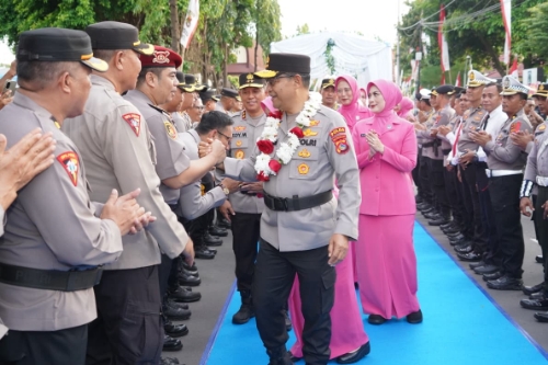 Kapolda NTB Irjen Pol. Edy Murbowo, S.I.K., M.Si. bersama istri berdiri di barisan depan, mengantar langkah terakhir pejabat lama melewati lorong pedang. Personel Polri mengenakan PDL II Kopel Rim tampak berjejer rapi, sementara Bhayangkari hadir anggun dengan busana seragam harian (PSH).